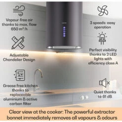 Klarstein Kronleuchter XL Island Exhaust Hood 90cm Exhaust Air: 590m³ / H LED Touch Black