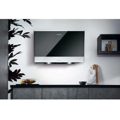 This Hotpoint cooker hood elegantly combines a black glass front with stainless steel accents to create a piece of kitchen art! It has 2 LED downlights to brighten up your cooking station and easy to use push button controls.