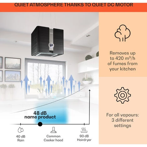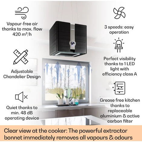 Free-hanging: ceiling-mounted island hood with 200-watt motor power