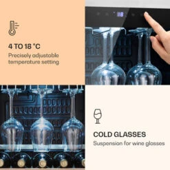For the love of wine: the Klarstein Vinamour 46 Uno wine refrigerator guarantees maximum enjoyment. With 155 litres of volume, it accommodates up to 46 bottles of wine on 10 levels and 9 wooden shelves and cools them to your desired temperature between 4 and 18 °C. In the upper part, there is a cool place to store 6 wine glasses – elegantly hanging upside down. Operation via touch control is convenient and simple. The illuminated interior skilfully showcases bottles and the glass door lets you see inside.